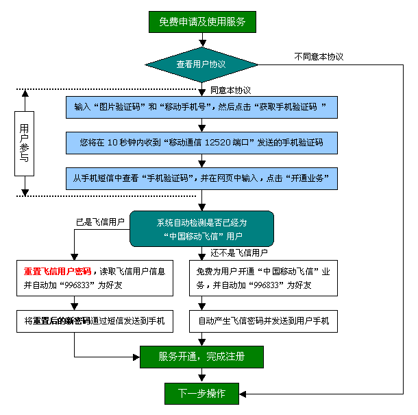5、從未開通過“中國移動飛信”業(yè)務的用戶,申請服務須完全同意免費開通“中國移動飛信業(yè)務”,并自動加“996833”為好友,開通后及時將“飛信初始密碼”告知用戶。請用戶記錄及保管好“中國移動飛信”初始登錄密碼,由于密碼丟失或密碼泄露給第三方造成給用戶造成的各類損失,本站概不負責。